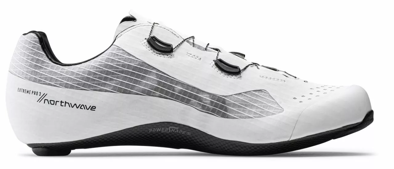 - Powershape-Carbon Sohle mit dem Steifigkeitsindex 15,0 aus 100% unidirektionalen Carbonfasern gefertigt und mit Powershape-System am Fußgewölbe ausgerüstet, mit dem eine 100%ige Kraftübertragung auf die Pedale gegeben ist