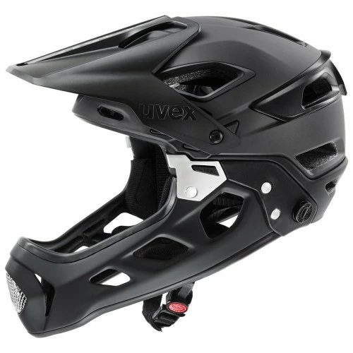 - Beim Enduro Mountainbiken ist Vielseitigkeit gefragt. Wenn die Uphill-Passage gemeistert und die Knieprotektoren zurechtgerückt sind, fällt der Startschuss für den uvex jakkyl hde. Mit nur einem Handgriff ist der abnehmbare Chinguard montiert. Aus der Halbschale wird so in Sekundenschnelle ein vollwertiger Fullface-Helm. Dämpfer auf, ein starker Tritt in die Pedale und schon geht’s es in Höchstgeschwindigkeit bergab. Dabei regulieren 14 Belüftungsöffnungen mit Fliegennetz das Helmklima. Die Größenanpassung erfolgt über das bewährte Anatomic IAS System. Clever: Unter dem verstellbaren Visier kann eine Goggle geparkt werden. Für sicheren Halt auf ruppigen Trails ist eine Brillenbandhalterung mit an Bord.